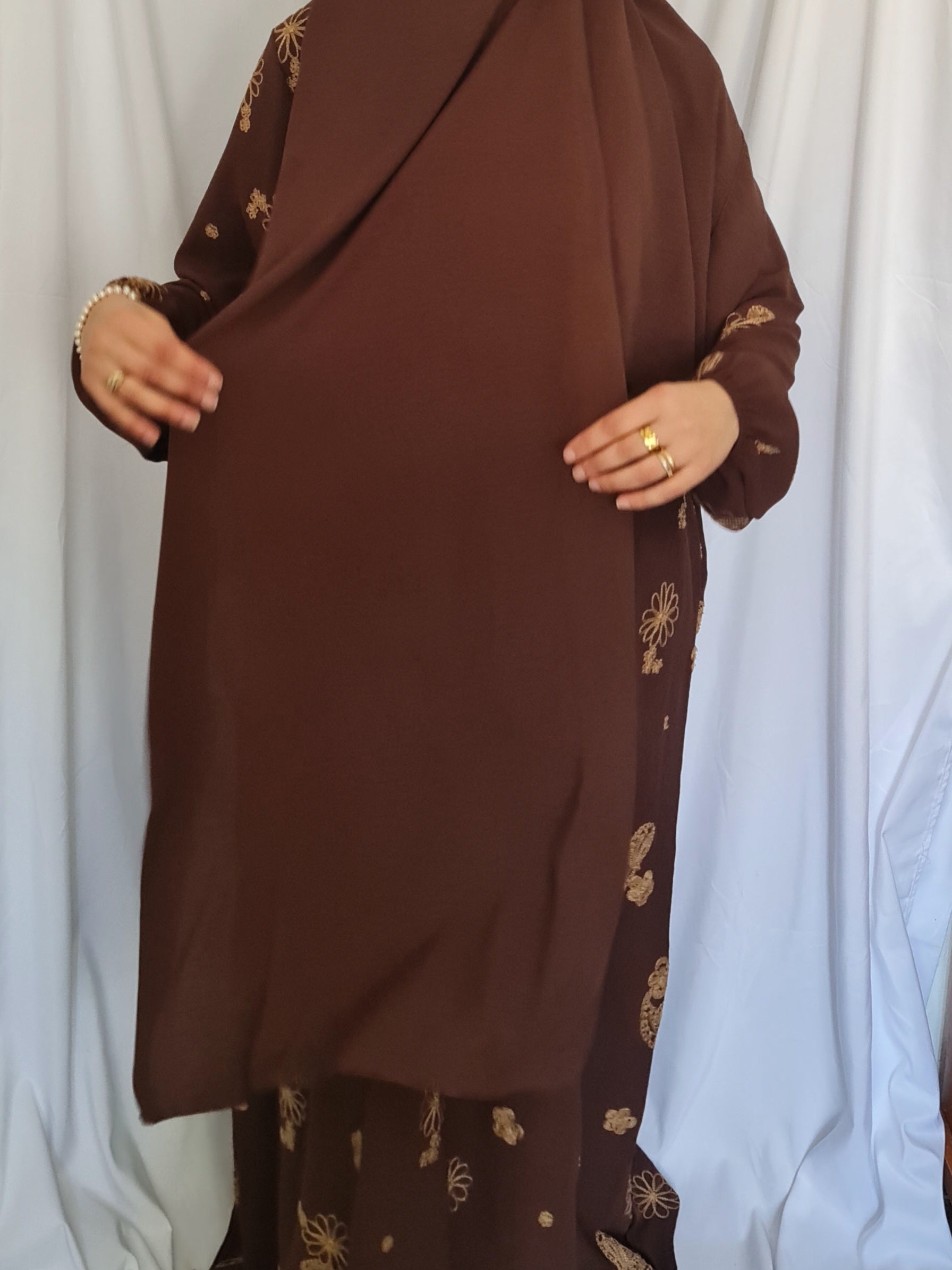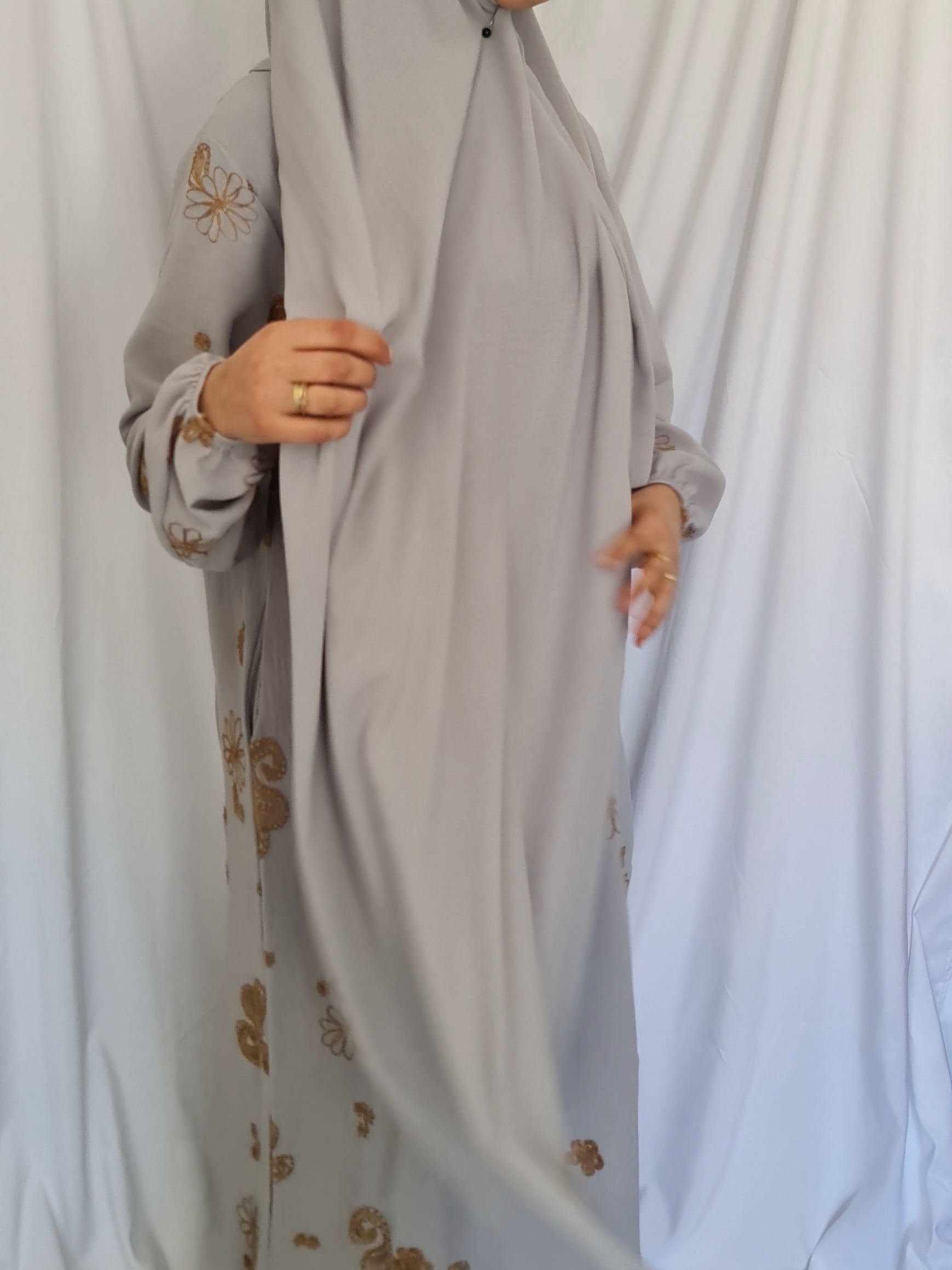 Esta colección presenta un diseño de abaya más romántico y artesanal, caracterizado por sus intrincados bordados. Al incluir el hijab largo a juego, crea un conjunto monocromático muy fluido y armonioso.