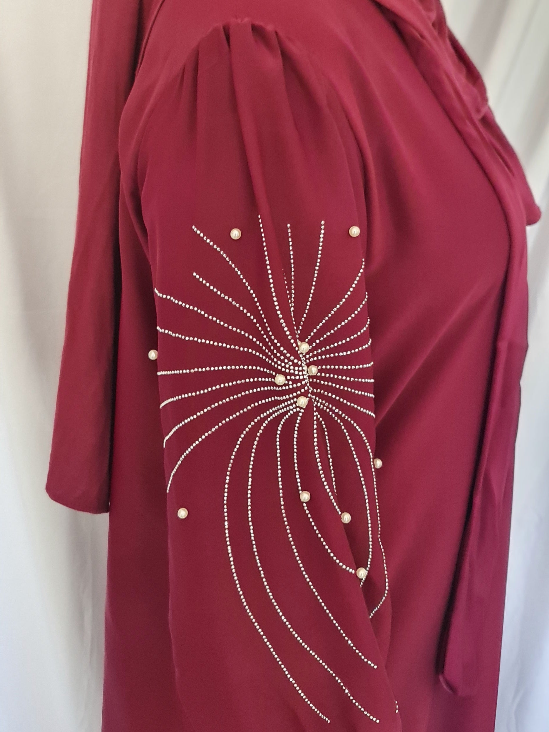 - Mangas de Impacto: Es el elemento central del diseño. Presenta un bordado de pedrería y perlas blancas en forma de estallido o motivo radial en la parte superior de la manga.
