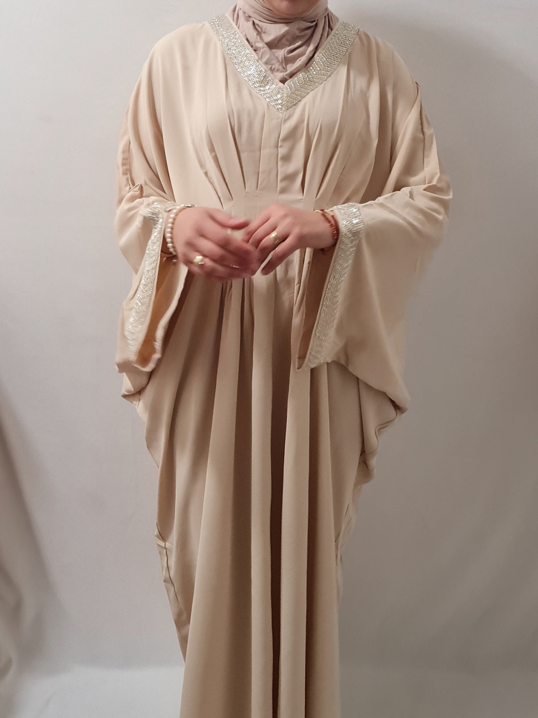 Corte: Se trata de un vestido tipo caftán o túnica con una silueta fluida y holgada.